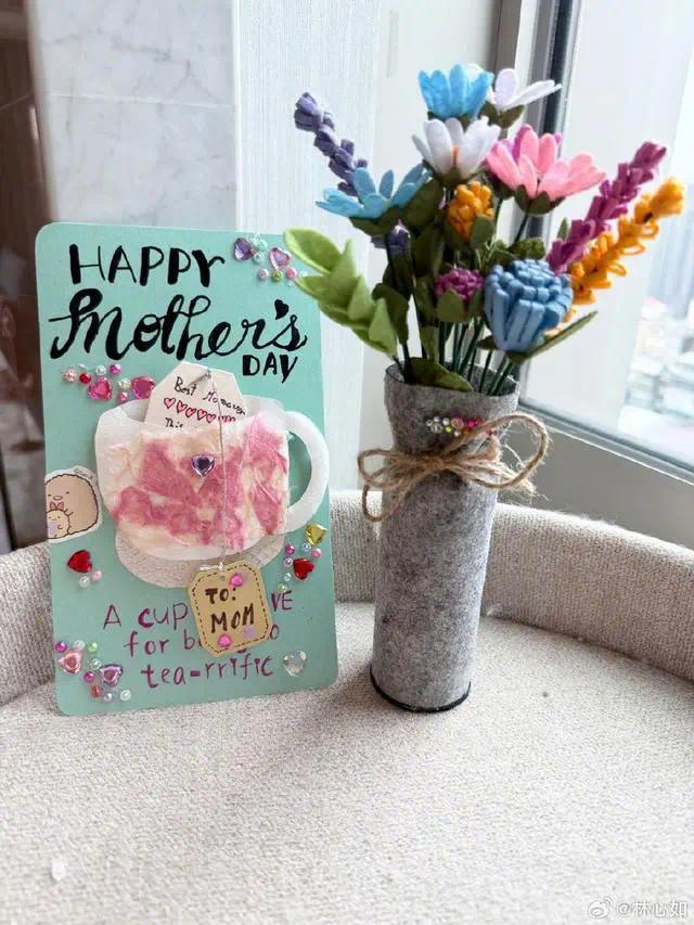 49岁林心如晒母亲节礼物!女儿手艺制造贺卡和花,才8岁画感很好,祝愿全全国的妈妈母亲节高兴,一起也祝愿林心如生了一个心爱女儿,拿着孩子预备的礼物摄影心境便是不一样了。