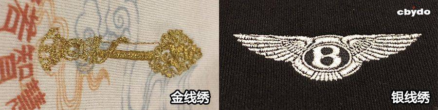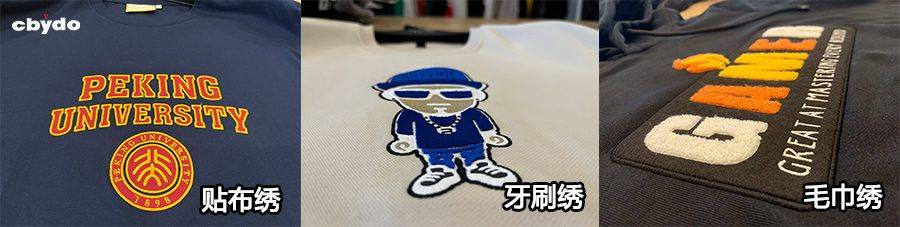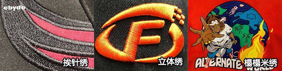 跳针绣主要用于LOGO等简单字体和图案;走针绣用于细小文字和细小纹路的图案;榻榻米绣主要用于面积较大更精细的花样图案。